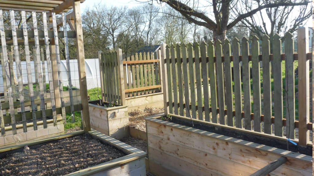 Des treillis de bois ralentissent efficacement le vent sur le carré potager.